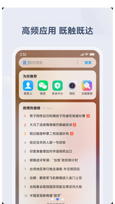 1、全局搜索:小米搜索APP支持全局搜索功能,用户可以在手机中快速搜索到想要的应用、文件、内容等。