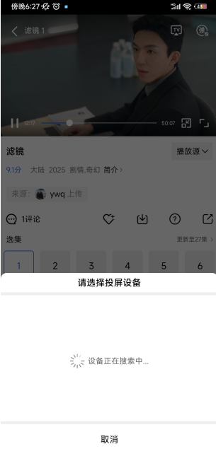 1、然后选择投屏设备即可,切记,手机和投屏的电视必须处于同一wifi状态下,否则会提示暂无设备。